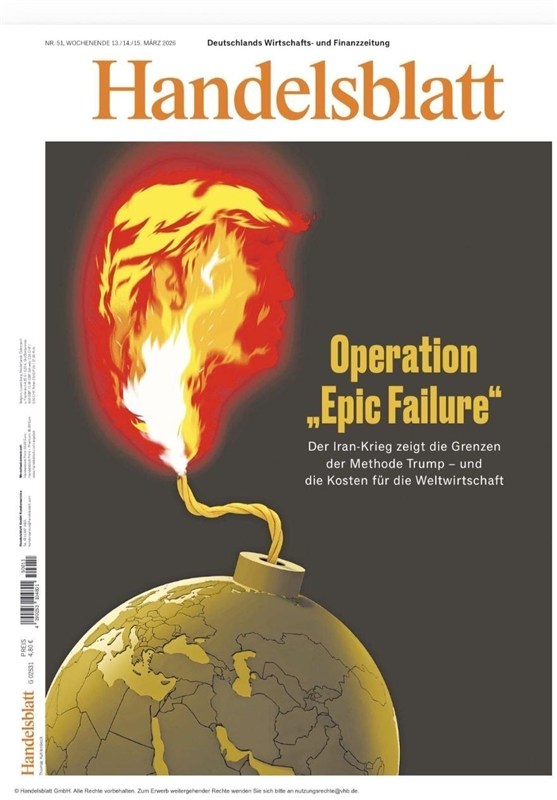 בדיווח מפורט, תיאר המגזין הגרמני Handelsblatt את מלחמת ארה"ב נגד איראן כמבצע "תבוסה אפית" (רמיזה לשם שבחרה ארה"ב למלחמה זו; זעם אפי) וכתב: גישתו של טראמפ הגיעה לנקודת שבירה.