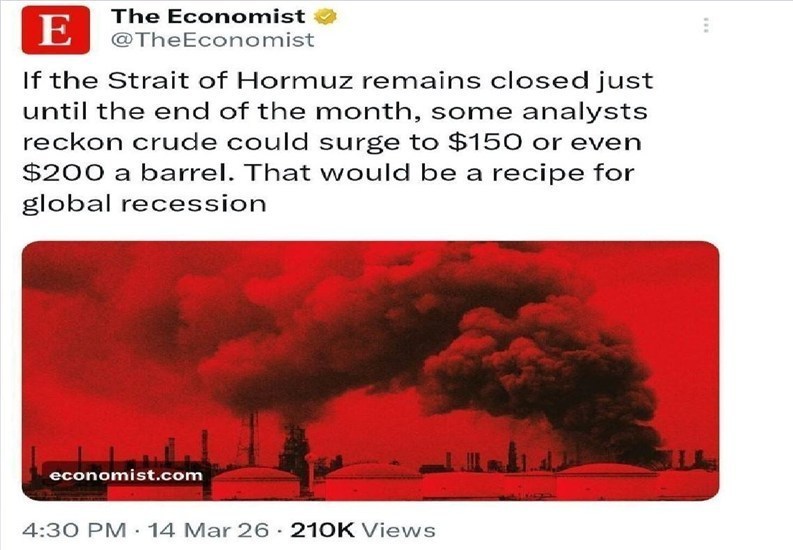 אקונומיסט הזהיר שאם מצר הורמוז יישאר סגור בעוד שבועיים, מחיר הנפט עשוי להגיע ל-150 עד 200 דולר