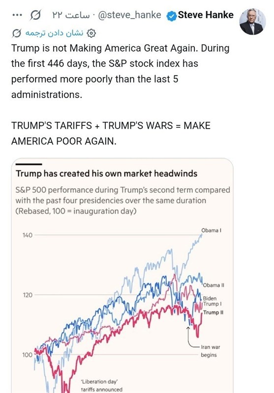 סטיב האנקה, כלכלן ידוע, טבע נוסחה: "תעריפי טראמפ + מלחמות טראמפ = להפוך את אמריקה לענייה שוב" – ובכך קרא תיגר על סיסמת הבחירות שלו.