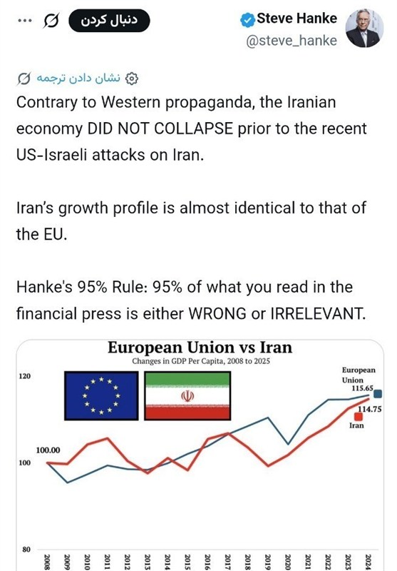 האנקה הדגיש באחד מפוסטים ברשת X כי קצב הצמיחה של כלכלת איראן בזמן המלחמה דומה לזה של אירופה, וכי בניגוד לציפיות ולתעמולה המערבית – היא לא קרסה.