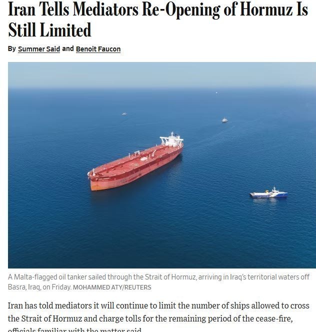 וול סטריט ג׳ורנל ציין: "הגורמים המעורים בנושא מסרו כי איראן הודיעה למתווכים כי במהלך התקופה שנותרה של הפסקת האש, היא תמשיך להגביל את מספר האוניות המורשות לעבור במצר הורמוז, וכן תגבה דמי מעבר מאוניות אחרות".