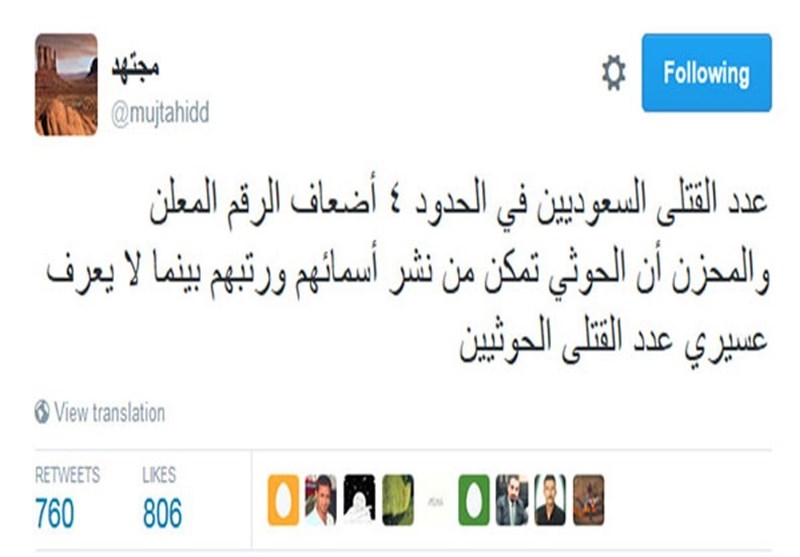 وأردف "عدد القتلى السعوديين عند الحدود ٤ أضعاف الرقم المعلن والمحزن أن الحوثي تمكن من نشر أسمائهم ورتبهم بينما لا يعرف (المتحدث باسم قوات العدوان على اليمن العميد أحمد) عسيري عدد القتلى الحوثيين.. هذا التصعيد هو نتيجة ما ذكره مجتهد من استفادة الحوثي من الهدنة التي أهداها إياه (وليّ وليّ العهد السعودي محمد ) بن سلمان فأعاد تموضع قواته وهرب كمية كبيرة من السلاح المتطور.. ابن سلمان أدرك أن استمرار المواجهة العسكرية لن يكون لصالحه فهو يستميت خلف الكواليس عن طريق الإمارات وعُمان للتفاهم مع صالح والحوثيين وإيران..