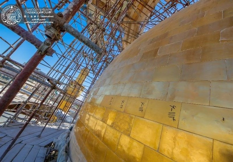 وأضاف الأعرجي" أما المرحلة الثانية هي المرحلة التي نحن بصدد الكلام حولها وهي مرحلة ما فوق الرقبة وصولا إلى قمة القبة الشريفة وهي منفذة من قبل مهجة الكوثر لإعمار العتبات المقدسة في العراق هذه المرحلة تتضمن عملية إعادة تذهيب 9217 بلاطة ذهبية".