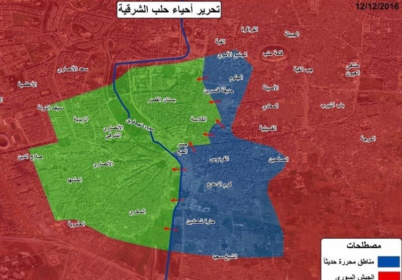 دمشق- تسنيم: بات مسلحو الأحياء الشرقية لمدنية حلب في وضع المنهار تماما بعد سيطرة الجيش السوري على أكثر من 98 بالمئة من هذه الأحياء.