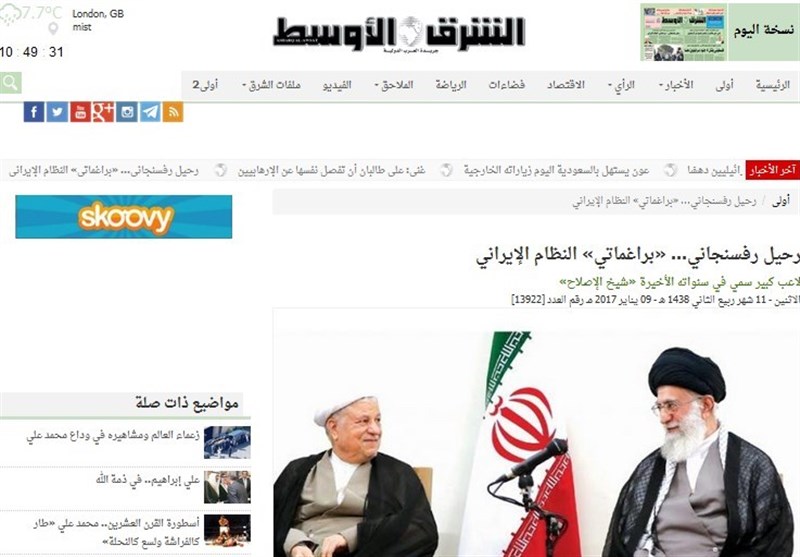 فقد نشرت صحيفة "الشرق الأوسط"، تقريرًا جاء تحت عنوان "رحيل رفسنجاني ..."براغماتي" النظام الايراني ، لاعب كبير سمي في سنواته الاخيرة "شيخ الاصلاح".