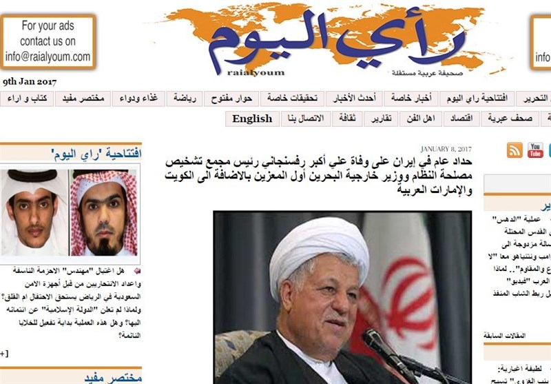 وعنونت صحيفة الرأي اليوم خبرها بعنوان "حداد عام في إيران على وفاة علي أكبر رفسنجاني رئيس مجمع تشخيص مصلحة النظام ووزير خارجية البحرين أول المعزين بالاضافة الى الكويت والإمارات العربية" وأشارت الصحيفة في خبرها هذا الى ابرز من قدم التعازي بوفاة آية الله رفسنجاني وماقاله المسؤولون الايرانيون وبيانات المؤسسات الايرانية حول رحيله ومن ثم تطرقت الى مسيرته السياسية.
