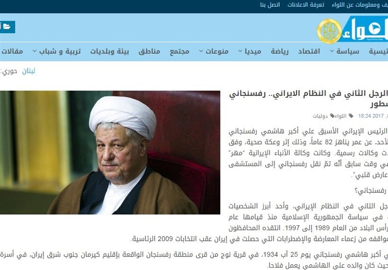 وتناولت جريدة اللواء اللبنانية الخبر بعنوان "وفاة الرجل الثاني في النظام الايراني.. رفسنجاني في سطور" وقالت، "هو الرجل الثاني في النظام الإيراني، وأحد أبرز الشخصيات المؤثرة في سياسة الجمهورية الإسلامية منذ قيامها عام 1979. رأس البلاد من العام 1989 إلى 1997. انتقده المحافظون بسبب مواقفه من زعماء المعارضة والإضطرابات التي حصلت في إيران عقب انتخابات 2009 الرئاسية".