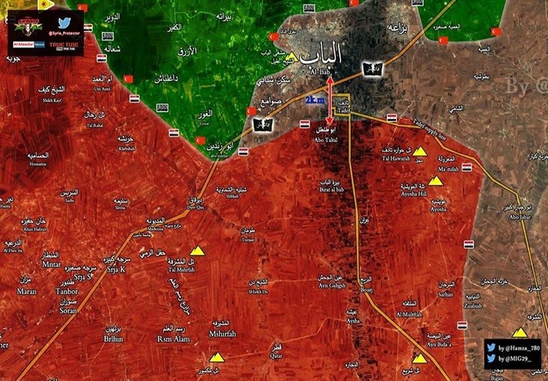 وأفاد مراسل تسنيم أن الجيش السوري سيطر على قرية "أبو طلطل" جنوب مدينة الباب وأصبح يبعد عن الباب أقل من 2 كم و بذلك تكون كل طريق إمداد التنظيم إلى المدينة قد سقطت نارياً.