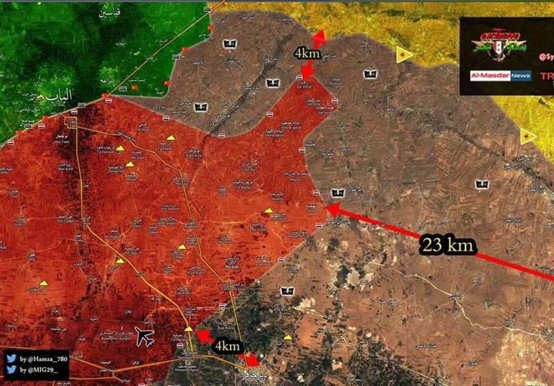وفي حلب حيث سيطر الجيش السوري على منطقة "جب الخفي" وبلدات (جب الحمام و جب السلطان و الزعرورة) بعد معارك عنيفة مع ارهابيي داعش بريف حلب الشرقي، لتصبح القوات على مسافة 4كم عن مسلحي "قوات سوريا الديمقراطية" ، كما حاصر الجيش قوات درع الفرات التي تدعمها تركيا داخل مدينة الباب وقطع الطريق أيضا عن درع الفرات التي تحاول الوصول إلى مدينة "منبج" بالريف الشرقي لحلب.