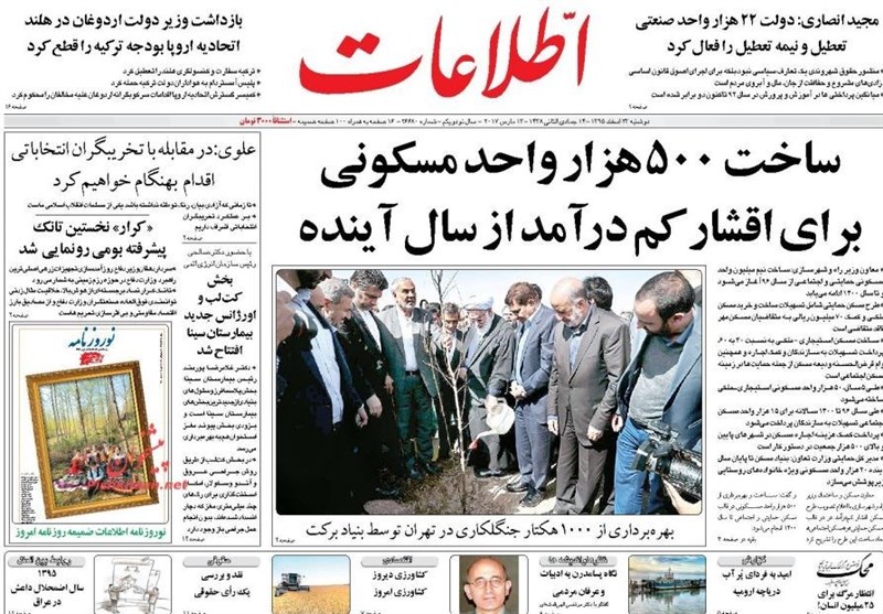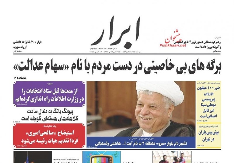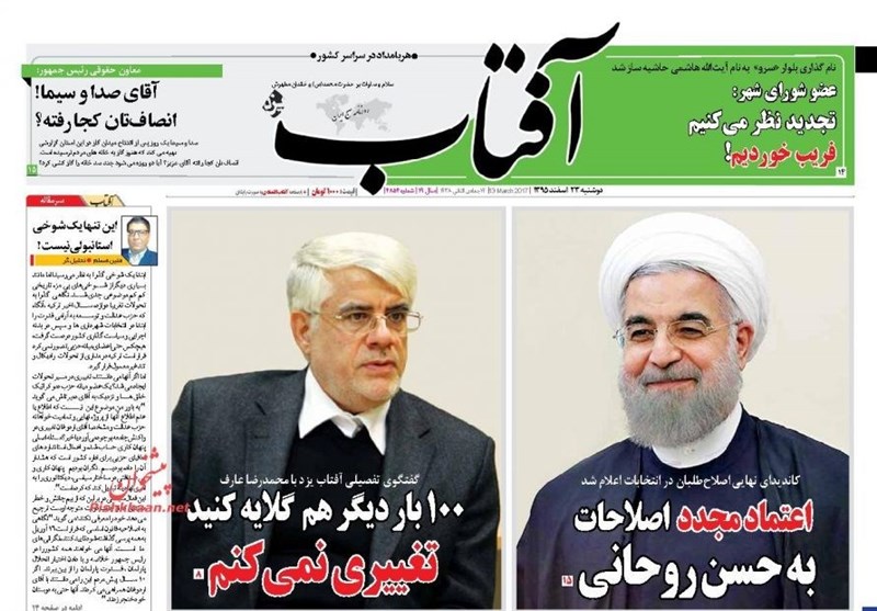 طهران - تسنيم: تداولت الصحف الإيرانية الصادرة بطهران صباح اليوم الاثنين مجموعة من الموضوعات والتقارير الخبرية، وابرزها اعلان الاصلاحيين عن مرشحهم للانتخابات الرئاسية رسميا و ازاحة الستار عن أول دبابة ايرانية متطورة.