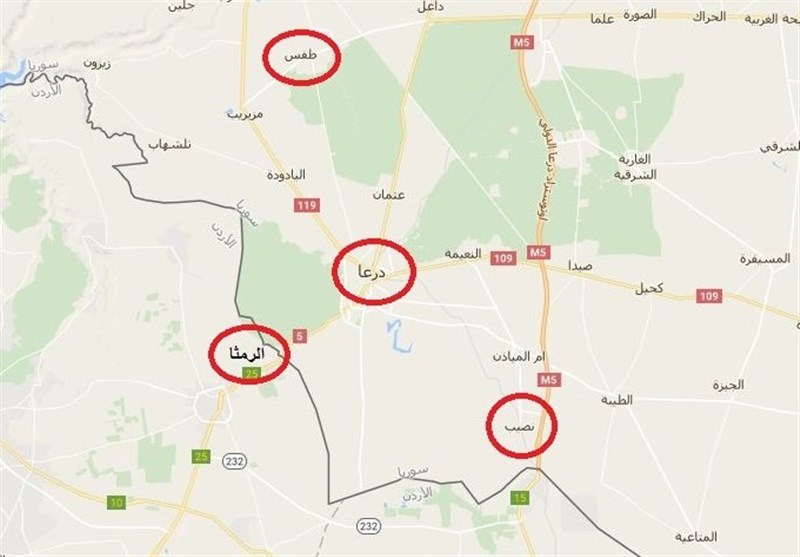 تشير المعلومات إلى أن السلاح والعناصر الإرهابية يدخلون من قرية قرب مدينة "الرمثا" الأردنية باتجاه طريق "السد"، ومنه إلى قرية "نصيب" شرق مدينة درعا، وإلى "طفس" في الجهة الشمالية الغربية وهما القريتان اللتان ينطلق منهما الإرهابيون المهاجمون لنقاط الجيش في "المنشية"