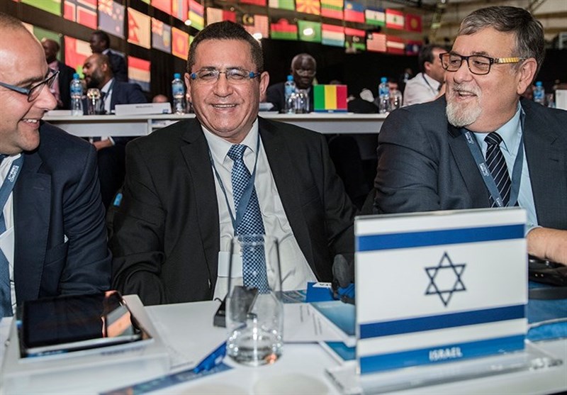 فيما بثت وكالة الأنباء الفرنسية "فرانس برس" صوراً لرئيس اتحاد الكيان الإسرائيلي لكرة القدم عوفر إيني والرئيس التنفيذي لرابطة كرة قدم الكيان روتيم كامير يتبادلون الابتسامات مع عدسات الكاميرا فيما يرفع أمامهم العلم الإسرائيلي ضمن أعمال المؤتمر السابع والستين.