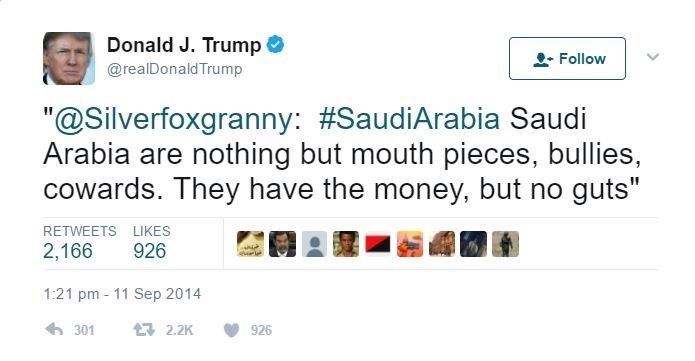 في نوفمبر 2014 كتب ترامب على حسابه الشخصي على موقع تويتر مهاجما السعودية، وقال في نص التغريدة: "السعودية لا تملك سوى الألسنة والتخويف، إنهم جبناء يملكون المال، ولا يملكون الشجاعة"