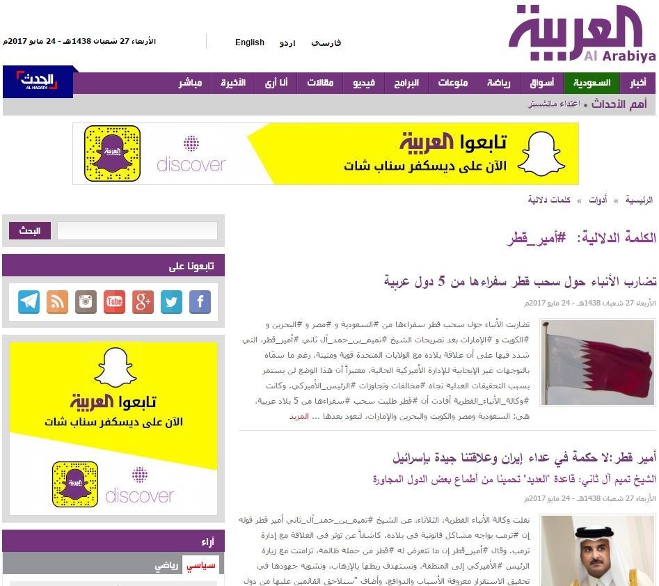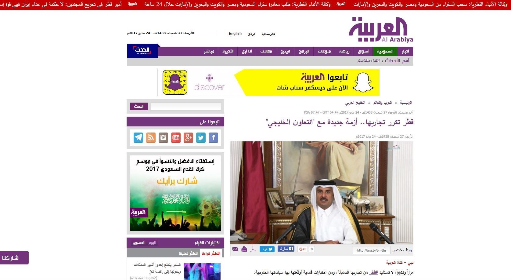 وبعد شد وجذب من الطرفين واستمرار التصعيد السعودي ضد قطر، أعلنت الوكالة القطرية أن موقعها قد تعرض للاختراق وإن الخبر غير صحيح، فيما يستمر هجوم الاعلام السعودي على قطر، ونشر موقع قناة العربية السعودية مقالا بعنوان «قطر تكرر تجاربها.. أزمة جديدة مع "التعاون الخليجي"»، جاء فيه: "مراراً وتكراراً، لا تستفيد قطر من تجاربها السابقة، ومن اختبارات قاسية أوقعتها بها سياستها الخارجية (..) لكن الودّ لم يدم طويلاً، فالسياسة القطرية ظلت مناورة في المواقف والأزمات، والآلة الإعلامية بقيت على عدوانيتها رغم أوقات متفرقة من الهدنة (..) فقطر العضو في مجلس التعاون الخليجي، لم تلملم بعد جراحات عزلتها من قبل ثلاثة من أعضاء المجلس عمدوا قبل نحو ثلاث سنوات وتحديداً في الخامس من مارس 2014 إلى سحب سفرائهم من الدوحة، وهو الحدث الذي عد بمثابة الزلزال في الأعراف الدبلوماسية الخليجية، وسابقة في تاريخ قطر منذ استقلالها".