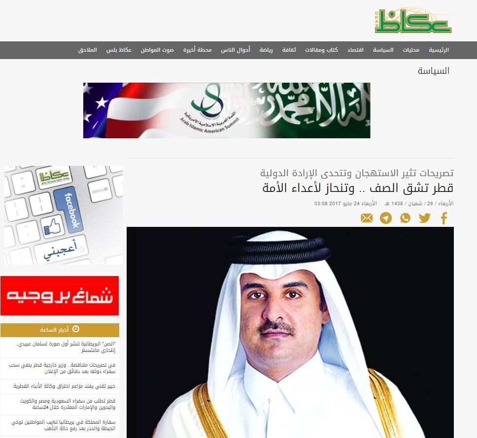 صحيفة عكاظ الرسمية السعودية هاجمت امير قطر بشدة وفي مقال تحت عنوان: " قطر تشق الصف .. وتنحاز لأعداء الأمة" كتب الصحيفة: "في تصريحات أثارت استهجان المراقبين، وُصفت بالمجازفة لما انضوت عليه من شقٍّ للصف العربي، عد أمير قطر تميم بن حمد آل ثاني حزب الله بأنه حزب مقاوم وان ايران دولة اسلامية تمث ثقلا اقليميا لا يمكن تجاهله –على حد قوله- محذرا مما أسماه التصعيد معها".