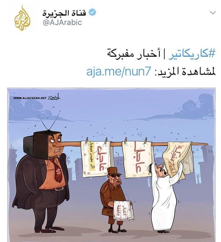 وسبق لكاريكاتير "أخبار مفبركة" أن انتشر كالنار في الهشيم بين المغردين من السعودية ودول أخرى، بعد أيام من تصعيد نبرة الخطاب الإعلامي وتبادل الاتهامات بين الإعلاميْن القطري والسعودي على خلفية تصريحات منسوبة لأمير قطر تميم بن حمد آل ثاني، قالت وكالة الأنباء القطرية إنها ظهرت على وقعها جراء عملية اختراق.