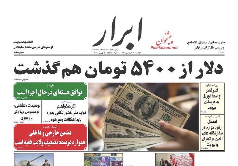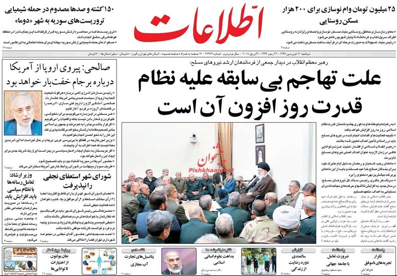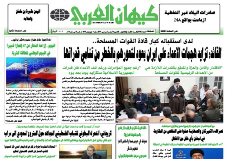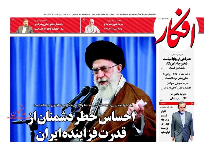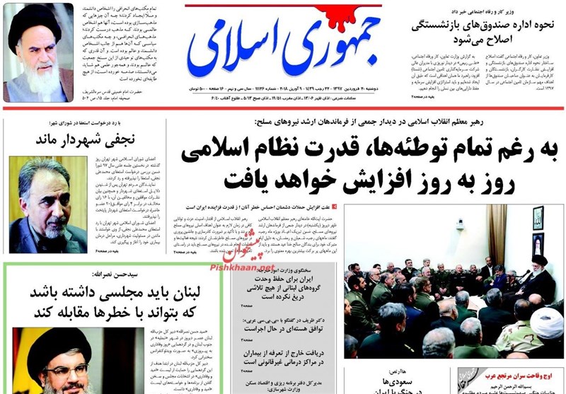 طهران / تسنيم // تداولت الصحف الايرانية الصادرة اليوم الاثنين (9 ابريل 2018) بطهران، عددا من القضايا المحلية والاقليمية والدولية، من ابرزها كلمة قائد الثورة الاسلامية خلال استقبال عدد من كبار قادة القوات المسلحة الايرانية.