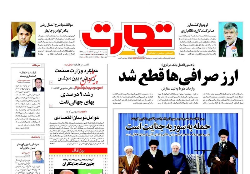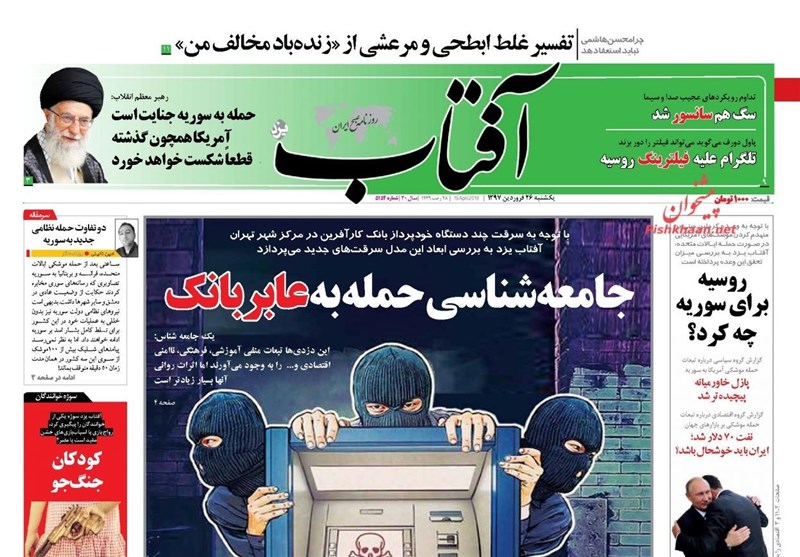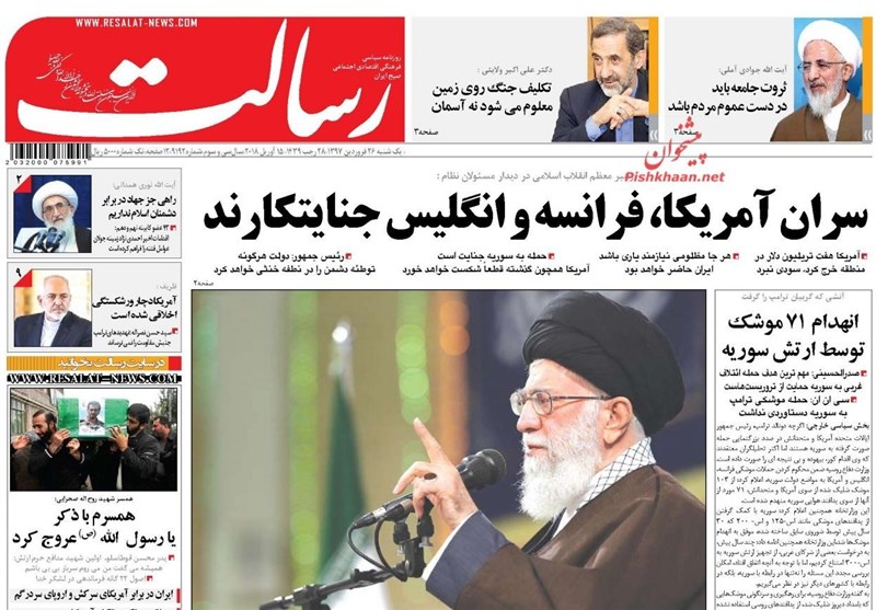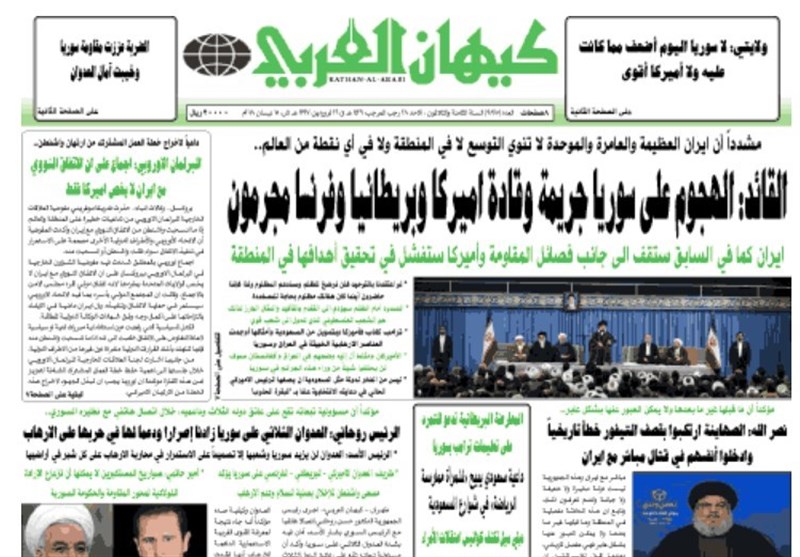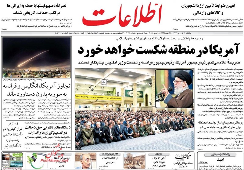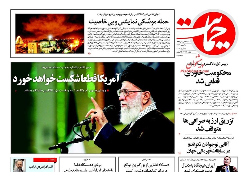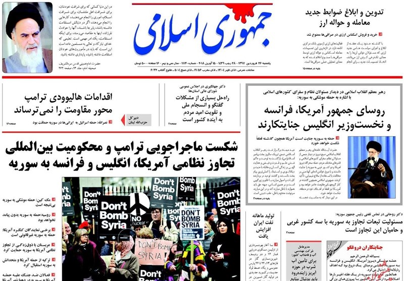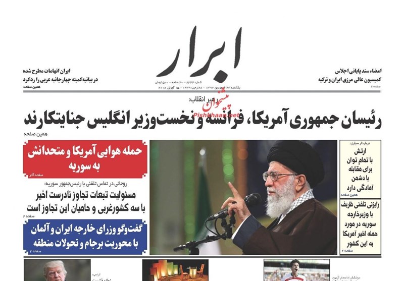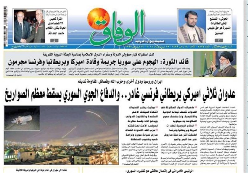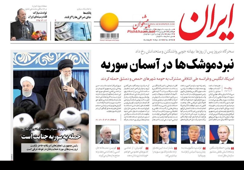 طهران / تسنيم // تداولت الصحف الايرانية الصادرة الاحد ( 15 ابريل 2018) بطهران، عددا من القضايا المحلية والاقليمية والدولية، من ابرزها العدوان الثلاثي الذي شنته الولايات المتحدة الامريكية وبريطانيا وفرنسا على سوريا وتصدي الدفاعات الجوية السورية لهذا العدوان.