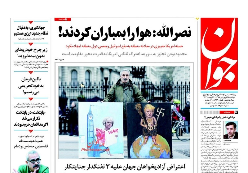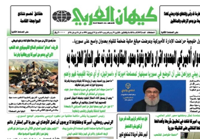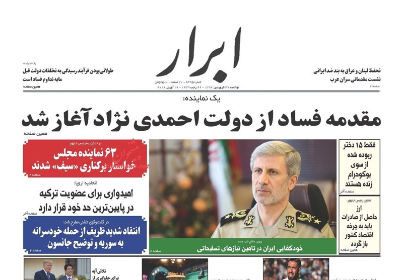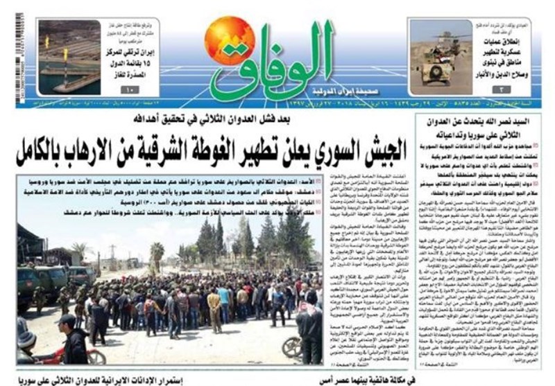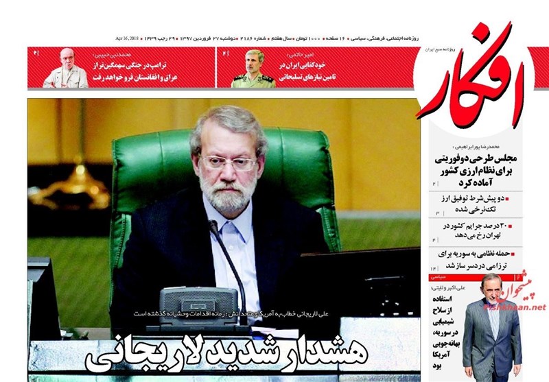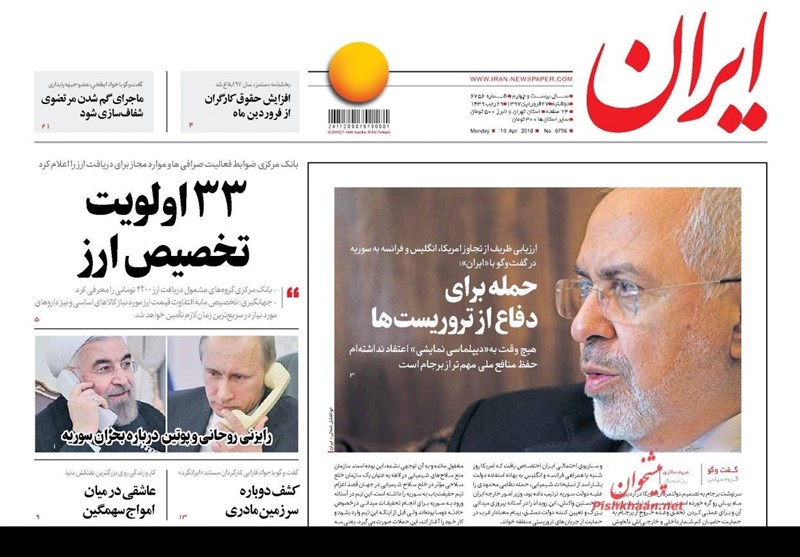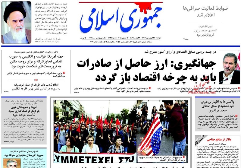 طهران / تسنيم // تداولت الصحف الايرانية الصادرة الاثنين ( 16 ابريل 2018) بطهران، عددا من القضايا المحلية والاقليمية والدولية، من ابرزها تداعيات العدوان الثلاثي الذي شنته الولايات المتحدة الامريكية وبريطانيا وفرنسا على سوريا وتصدي الدفاعات الجوية السورية لهذا العدوان.