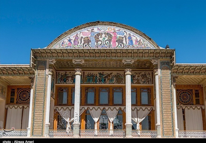 كما وان عمارة متحف عفيف اباد، حيث الفنون الإيرانية العريقة والنفائس التأريخية، والذي يوجد فيها قصر ملكيٍّ مهيبٍ ذو طابقين يتوسّط الحديقة ويُعَد بناؤه من الآثار التأريخية والجمالية حيث كان مكان نزول ونزهة الملوك الصفوية. وتمّ تشييده على يد (ميرزا علي محمد خان) بإعتباره أحد أروع التحف المتبقية من العهد القاجاري، حيث ان واجهته تتربّع عليها زخارف القاشاني المزيّنة بنقوشٍ جميلة مأخوذة من العهد الساساني، كما يوجد إيوانٌ في الجهة الشمالية يُعتبَر مدخل القصر وإستمدّ الهامه في البناء من النمط الأخميني حيث تمّ تزويده بمبنى مرتفعٍ له أعمدةٌ تتزيّن بأعمال التجصيص الرائعة فضلاً عن النقوش التي تزيّن سقفه، أما الإيوان الجنوبي فهو بنفس الجمال والإيوان الشرقي يتمتع بالفخامة ايضاً.