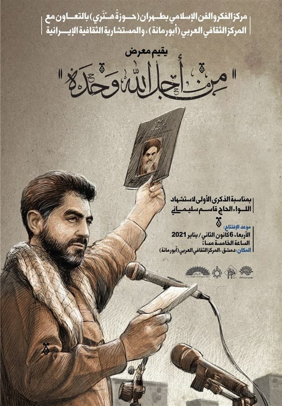 وأفادت وكالة تسنيم الدولية للأنباء انه بالتزامن مع الذكرى الأولى لاستشهاد باسل جبهة المقاومة اللواء الحاج قاسم سليماني سيقام معرض للصور والملصقات "فقط لله" و "قصة عشق" في "مركز أبو رمانه الثقافي" و "مركز كفرسوسة الثقافي" بالعاصمة السورية دمشق.
