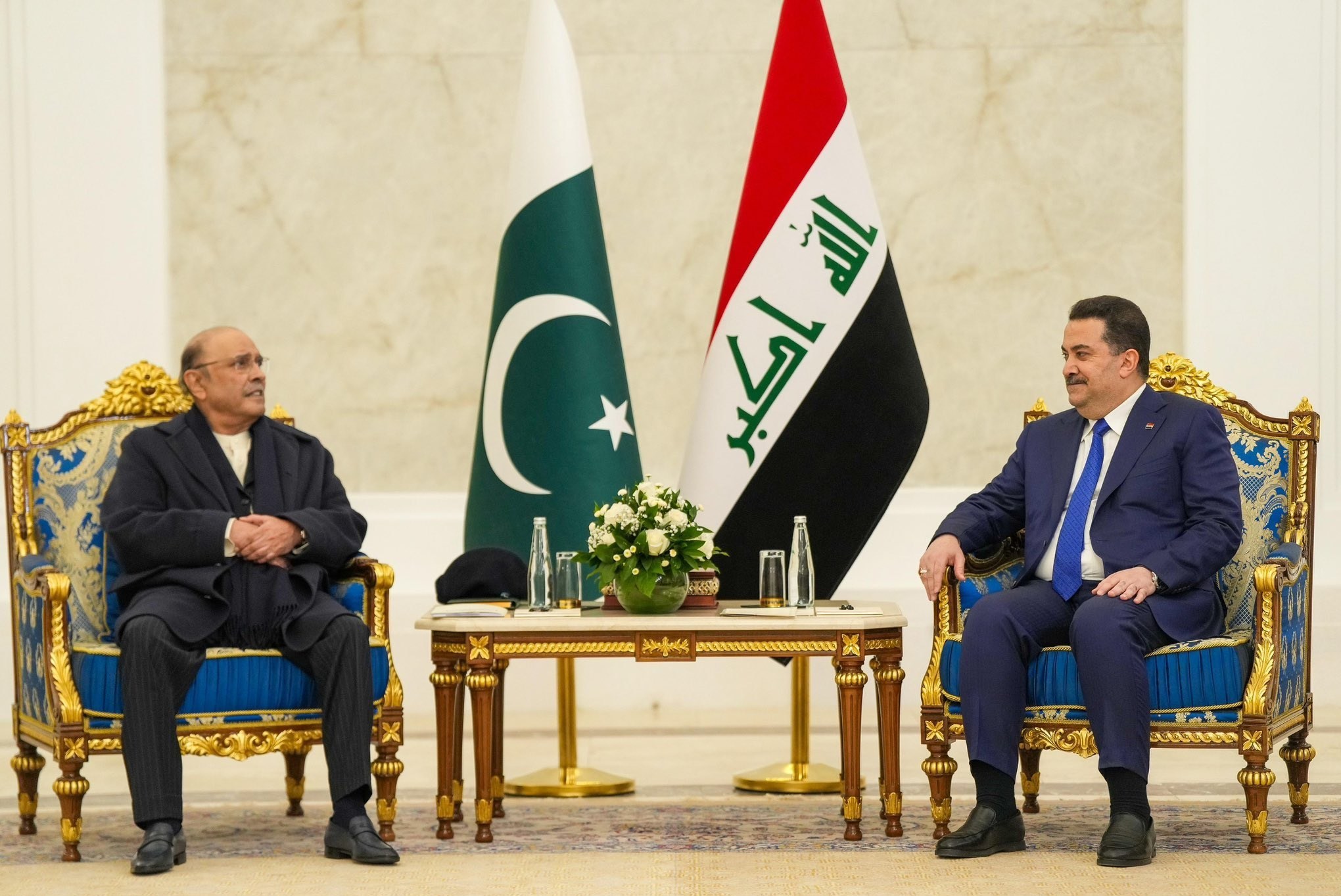 من جانبه أشاد زرداري بالعراق كدولة تاريخية وحضارية، وأكد حرصه على زيارة بغداد، تأتي اعتزازاً وإيماناً بأهمية العراق في العالم الإسلامي والشرق أوسطي.