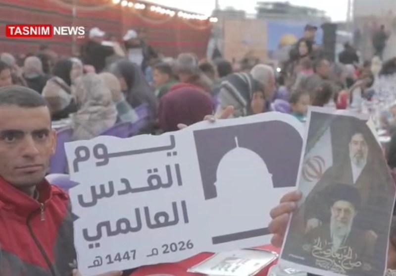 اللقاء الذي أقيم إحياءً ليوم القدس العالمي شهد مشاركة أطفال وأبناء شهداء من غزة، حملوا صور القائد الشهيد آية الله السيد علي الخامنئي(ره)، إلى جانب لافتات كتب عليها: "الشعب الفلسطيني كله مع إيران".