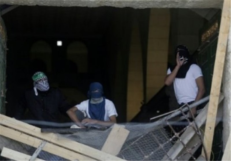 Masked Palestinians barricade one of the doors of Jerusalem's al-Aqsa Mosque, one of Islam's holiest sites, on September 27, 2015, as they plan to remain inside to protect it in case of Israeli aggression; @AFP