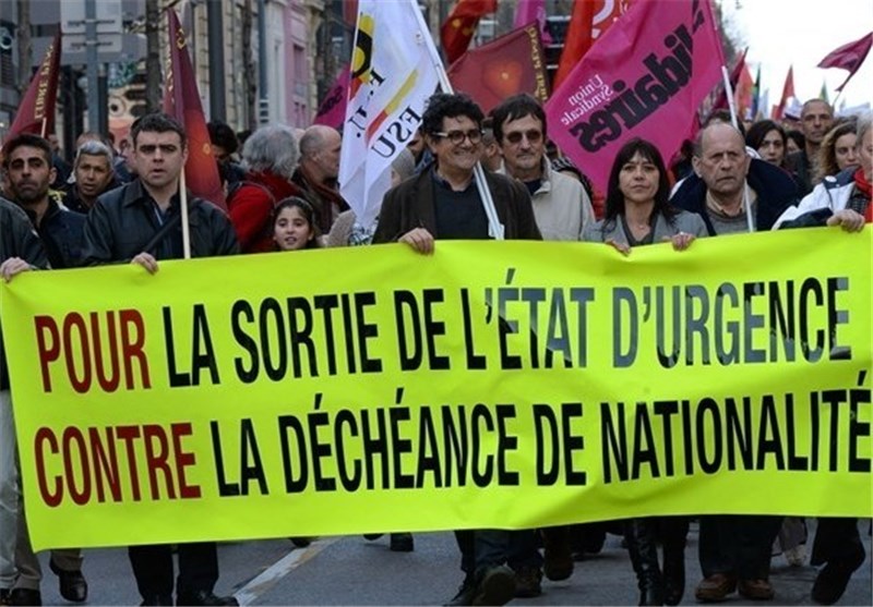 TEHRAN (Tasnim) - Protesters took to the streets in Paris on Saturday to slam the proposed extension of a state of emergency that was imposed after the terrorist attacks of November 2015 in the French capital.