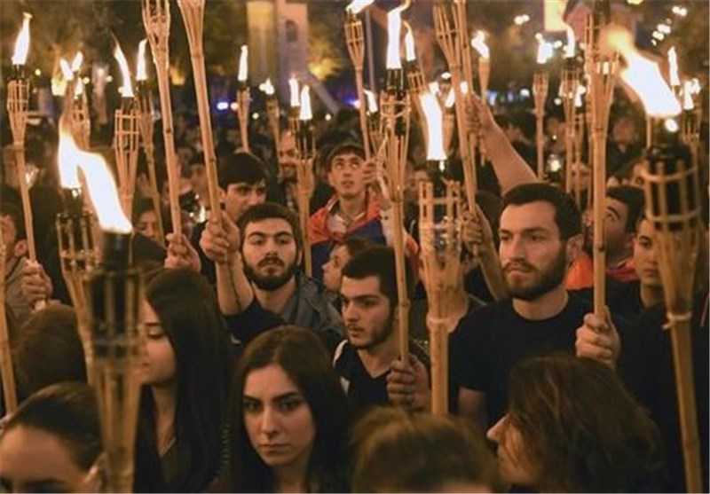 On Saturday, demonstrators began a torchlight march to a hilltop memorial complex dedicated to millions of Armenians massacred a century ago by Ottoman Turks.