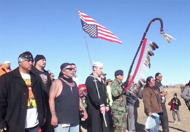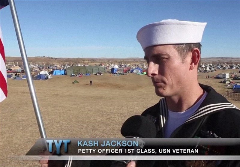According to Tasnim dispatches, Kash Jackson joined protesters in North Dakota on Saturday and expressed his wrath over the oil project by holding an upside down American flag.
