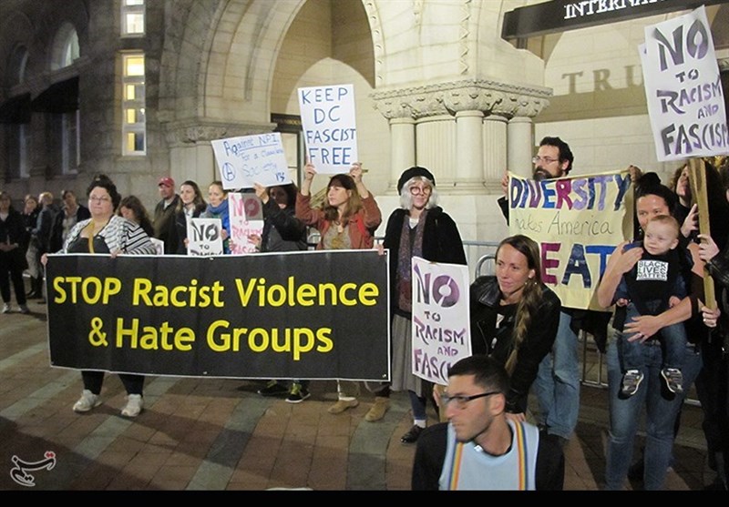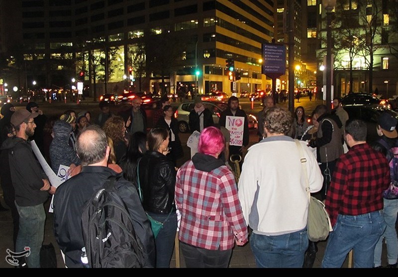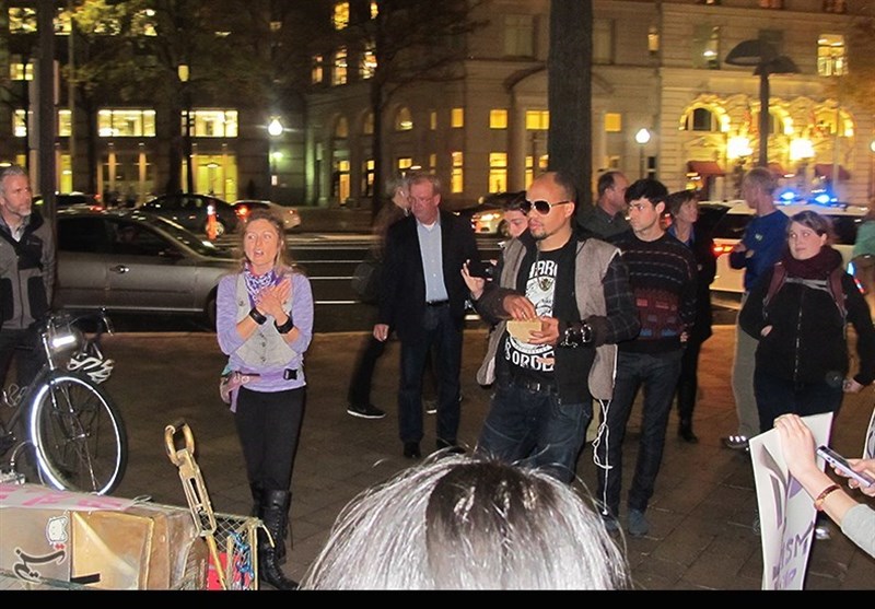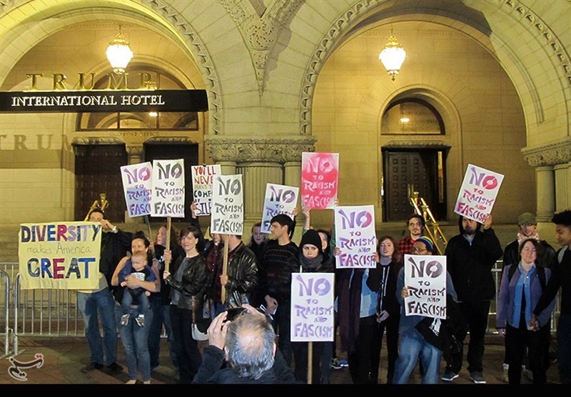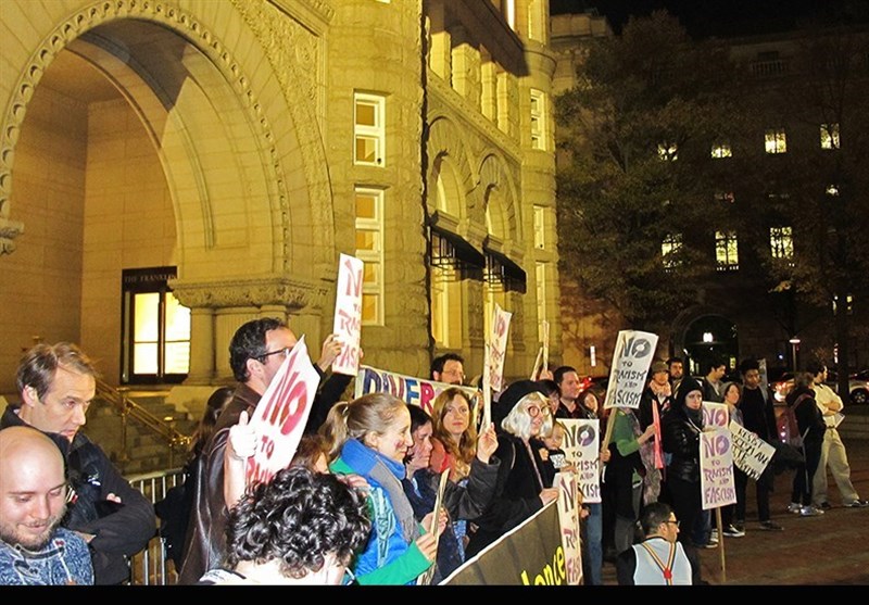 According to Tasnim dispatches, tens of political and civil activists gathered in front of the Trump International Hotel on Friday, chanting slogans and carrying banners reading, among others, “Islam Is Not Terrorism”, “No to Trump”, “No to Racism and Fascism”, and “No to Islamophobia”.