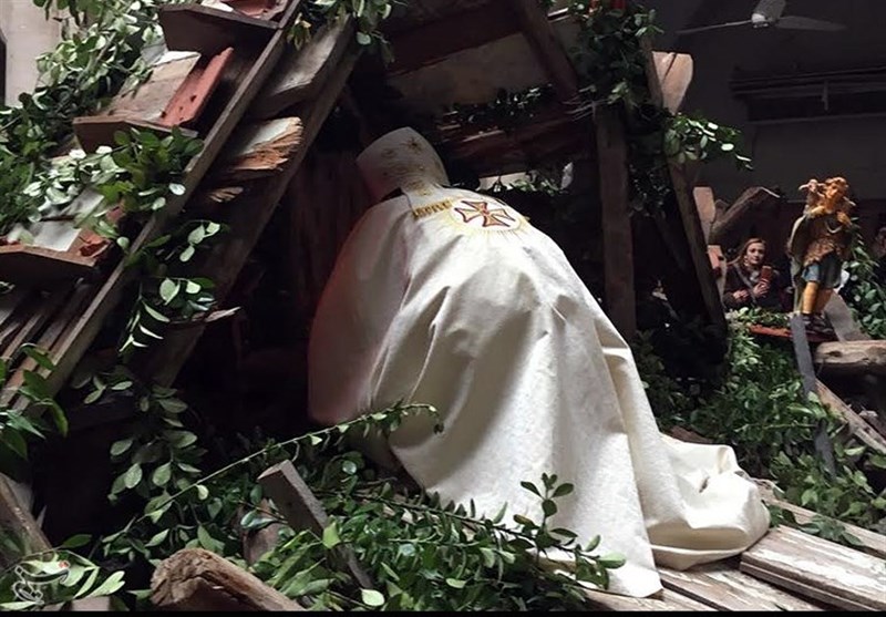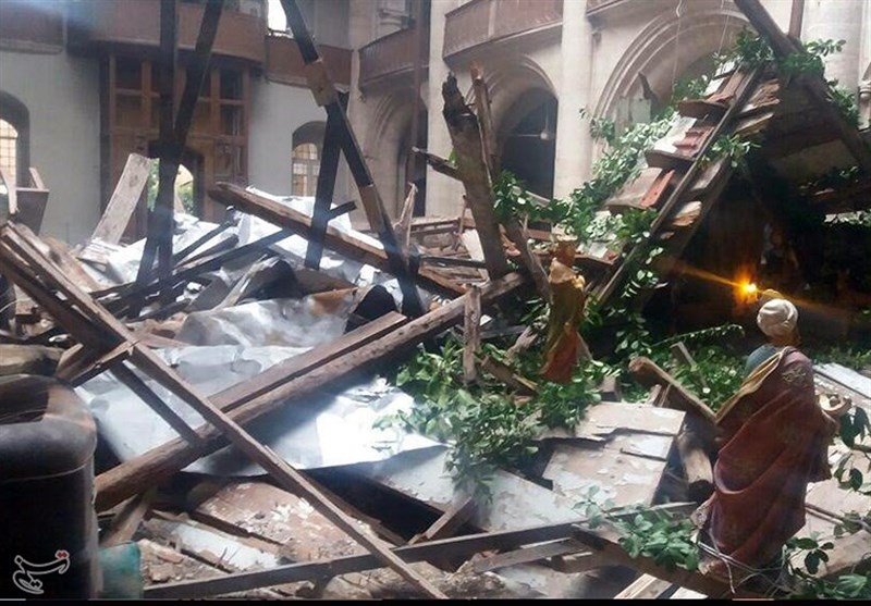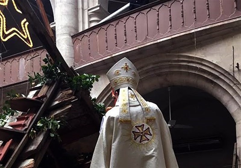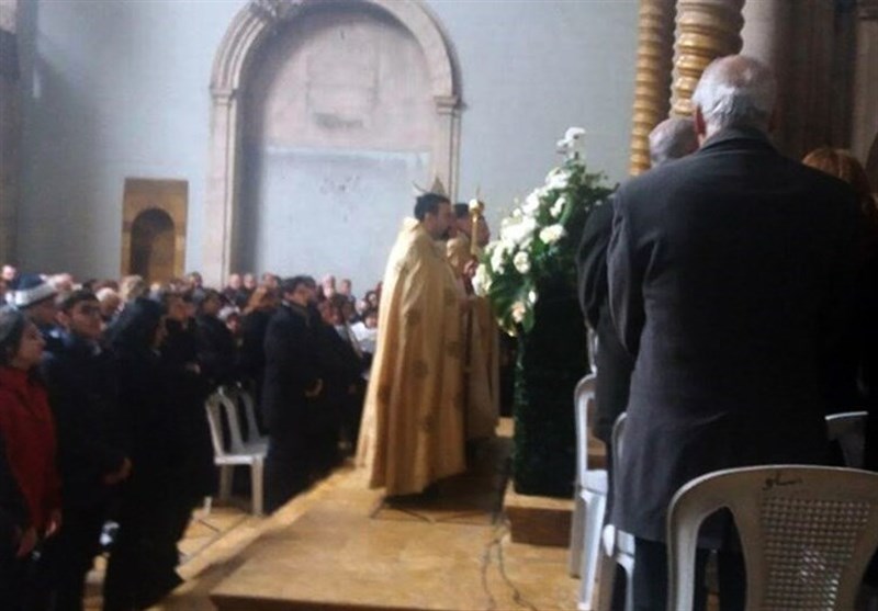 According to Tasnim dispatches, the New Year’s Day service was held on Sunday in the rubbles of Deir Mar Elias Church ruined by foreign-backed militants.