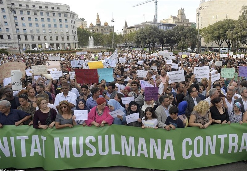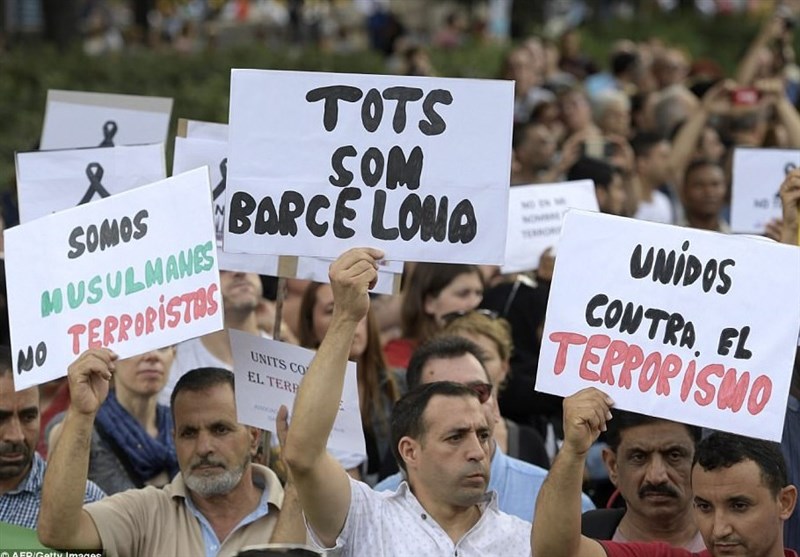 Improvised placards reading "We are also victims," "Terrorism has no religion," "We are all Barcelona, not terrorism," were held by the crowd.