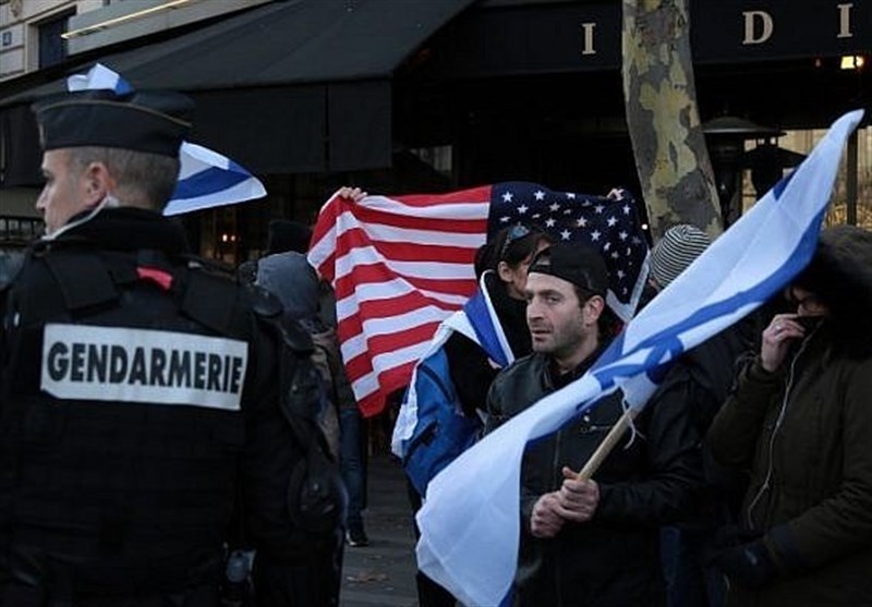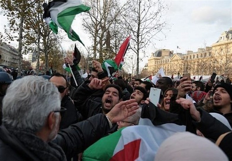 Protestors carried Palestinian flags and photos of French President Emmanuel Macron marked "accomplice" for hosting Netanyahu following Trump's decision to recognize Jerusalem as the capital of Israel.