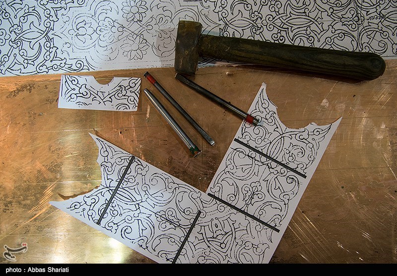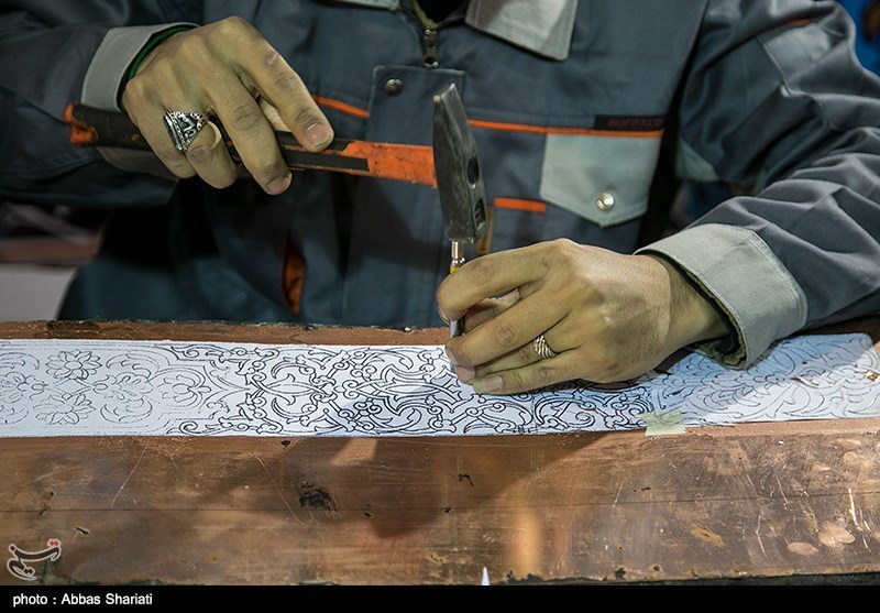 In this method, some parts of the metal is removed by steel tools depressing the metal. In special cases, (if copper has been covered by tin), the red color shine and gloss of copper can be observed beside the silver color of tin. This method is considered to be the oldest among all the methods of engraving being performed in a similar course known as carving without hammer.