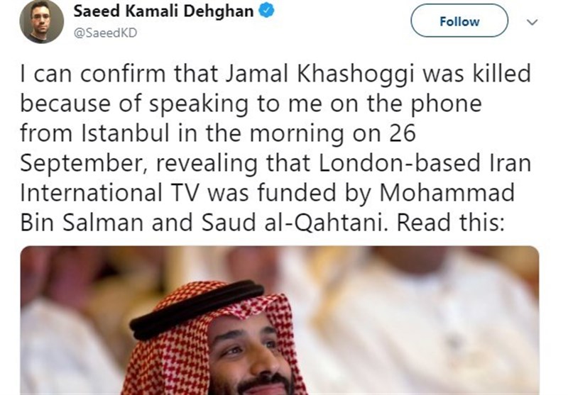 Now the Guardian correspondent, in a Friday tweet, has revealed that his source was Khashoggi, the Washington Post columnist who was assassinated on the same day as the report was published in a premeditated murder in Turkey blamed on Saudi Crown Prince Mohammed bin Salman also known as MBS, Press TV reported.
