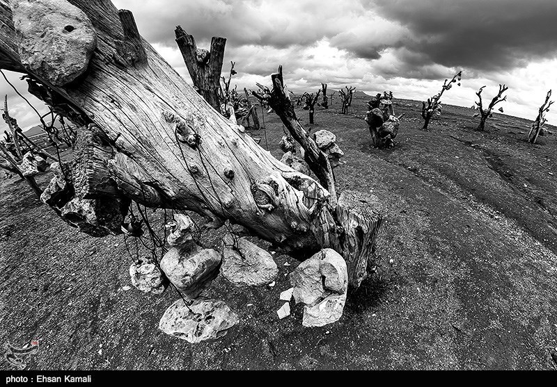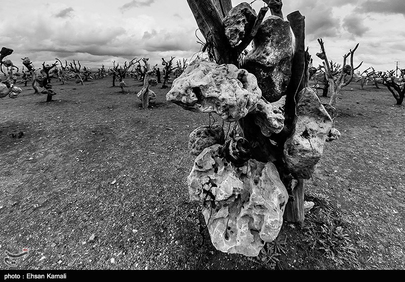 He implanted dried bodies of the trees on desert holding heavy stones hanged by wires! Any stone and tree relates a special memory of his last forty years.