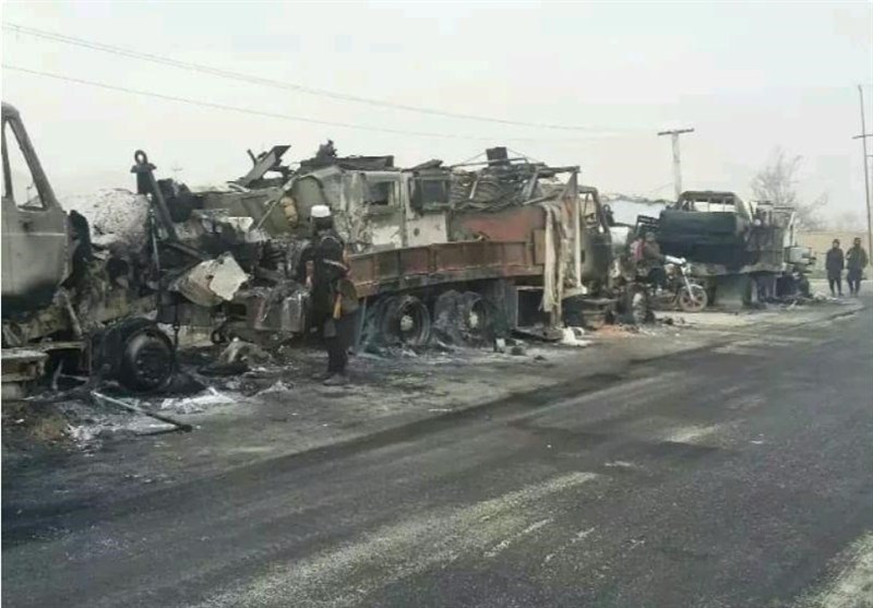 A video released Saturday by Ariana news shows the burned vehicles left on a road to Sherin Tagab