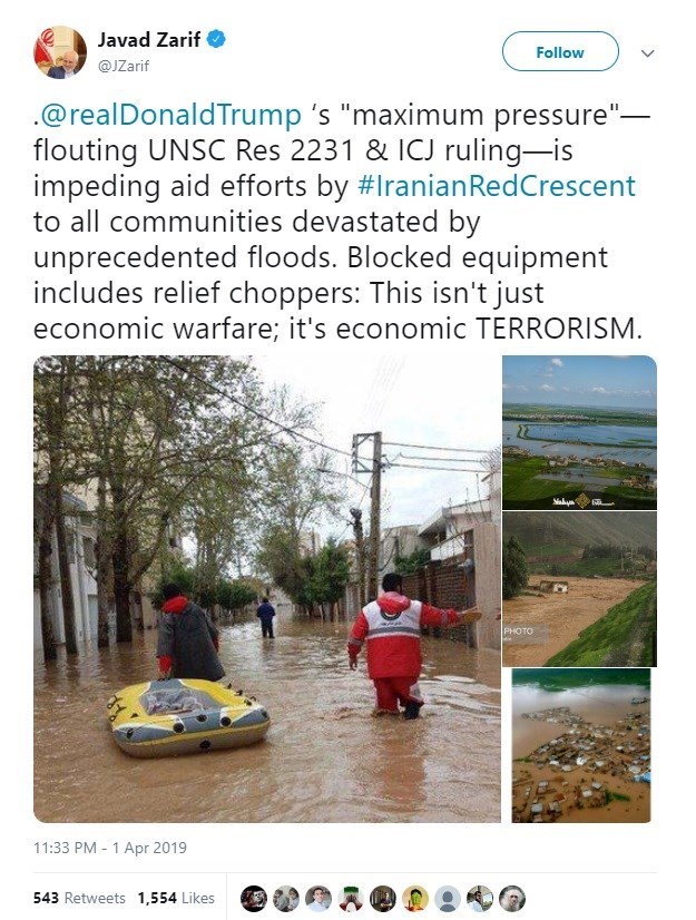 In a post on his Twitter account, Zarif blamed the difficulties with relief efforts after the recent devastating floods in Iran on the US policy of pressures and sanctions against Tehran.
