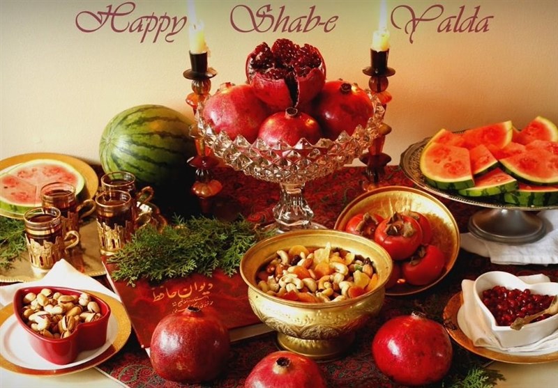 Fruits, particularly pomegranates and watermelons, and nuts are served in this night. The fruits signify the hope for having a fruitful spring and summer.