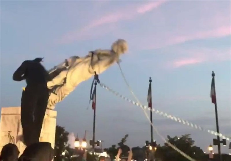 Demonstrators used ropes to topple the monument near the Little Italy neighborhood, news outlets reported.