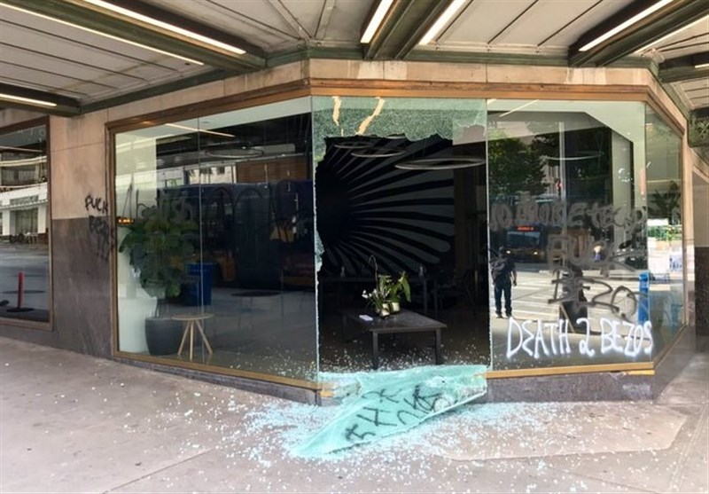 One of the rioters can be seen spray painting “Raze Amazon” on the outer wall of the building, housing the shop.