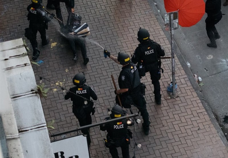 Police in riot gear faced off against the demonstrators, some of whom held up umbrellas against falling pellets of pepper spray.
