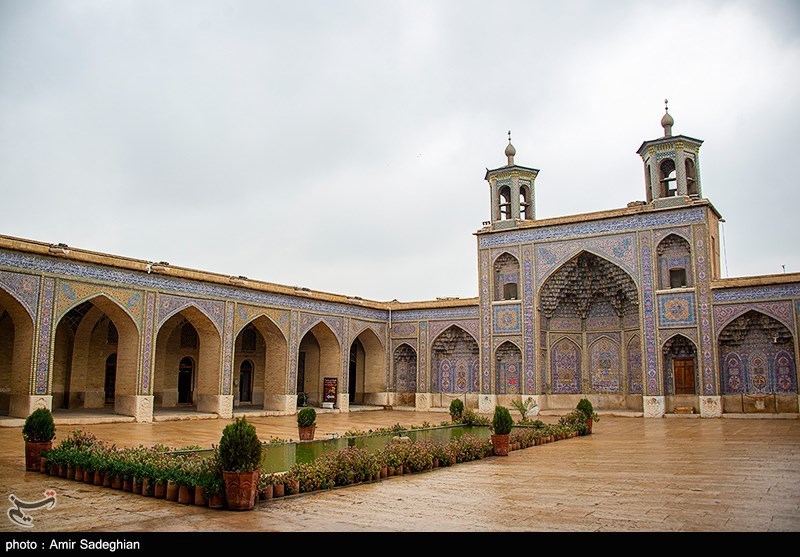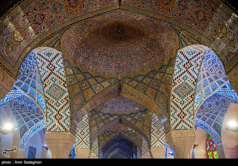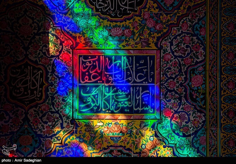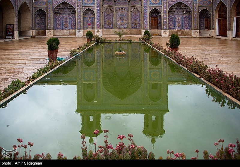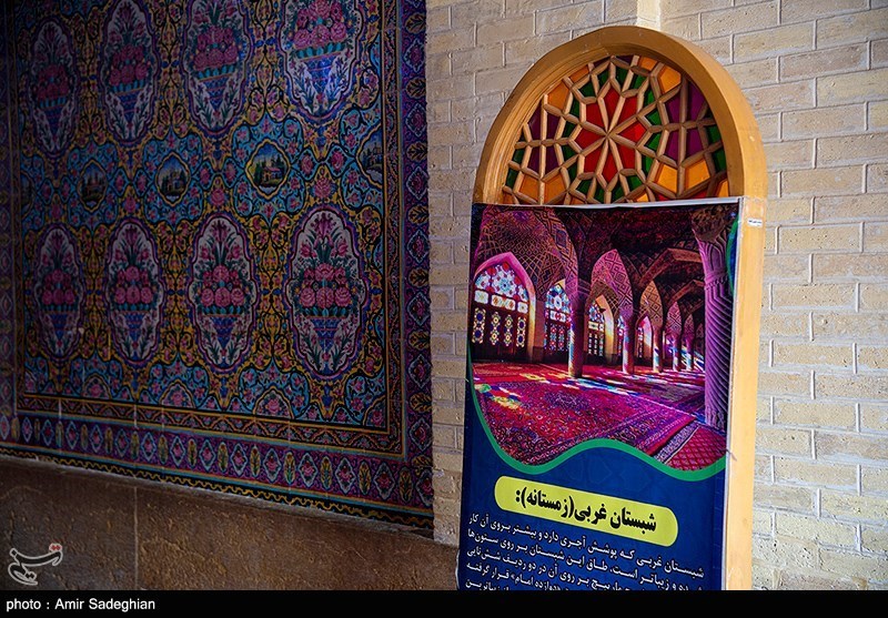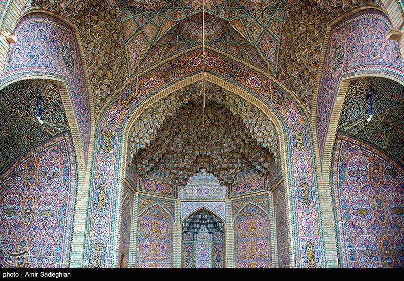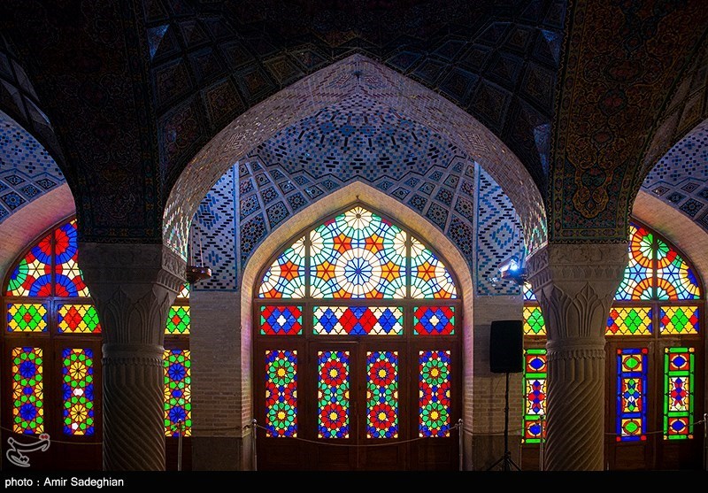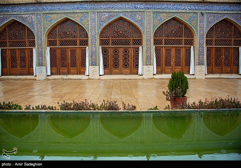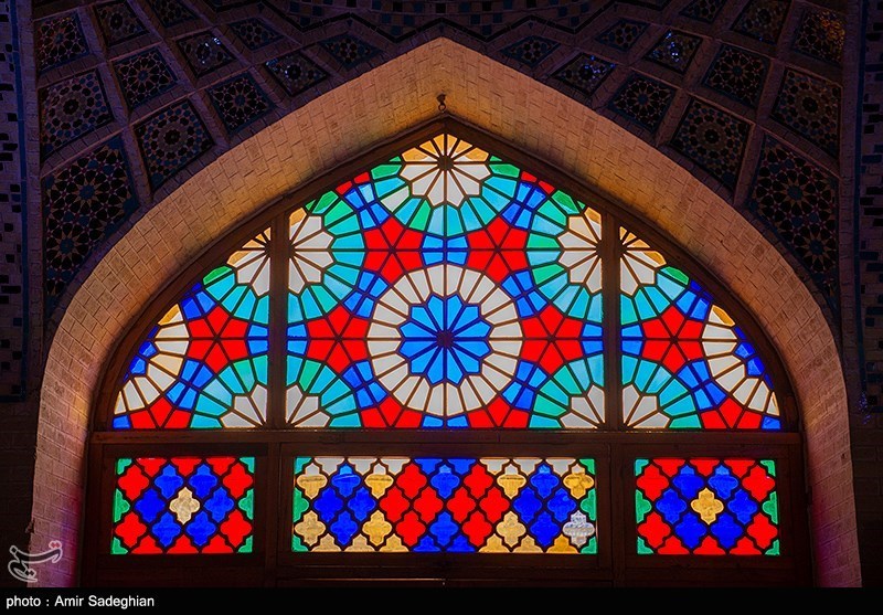 The mosque extensively uses colored glass in its facade, and it displays other traditional elements such as panj kaseh-i (five concaves) in its design. It is also named in popular culture as Pink Mosque due to the usage of beautiful pink color tiles for its interior design.