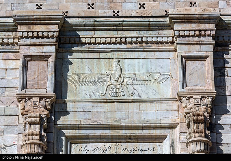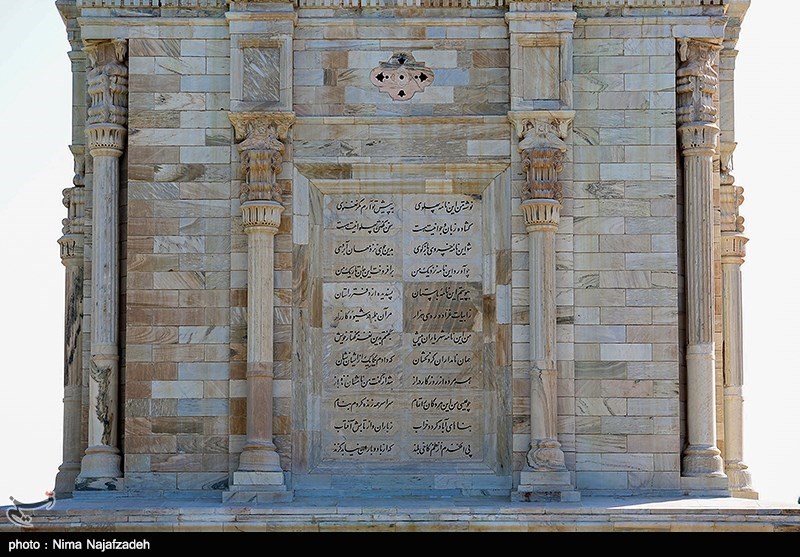 The facades are made up of marble and pillars are decorated in Achaemenid architectural style. There is also some calligraphy of verses of Shahname on them. The chamber is in the middle of a 6,000 square meter green site which is also home to the Toos Museum and a library.