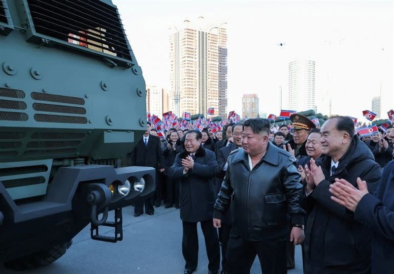 Images showed Kim in a black jacket, alighting a mobile missile launcher near the main stage as thousands of people waved small North Korean flags.