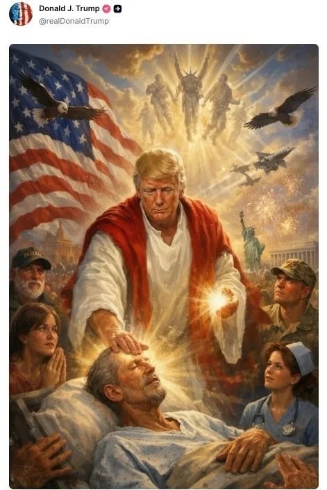Later, Trump posted a picture suggesting he had saint-like powers akin to those of Jesus Christ (AS). Wearing a biblical-style robe, Trump is seen laying hands on a bedridden man as light emanates from his fingers, while a soldier, a nurse, a praying woman and a bearded man in a baseball cap all look on admiringly. The sky above is filled with eagles, an American flag and vaporous images.