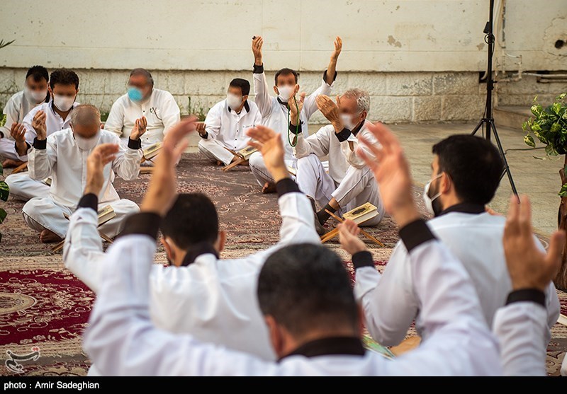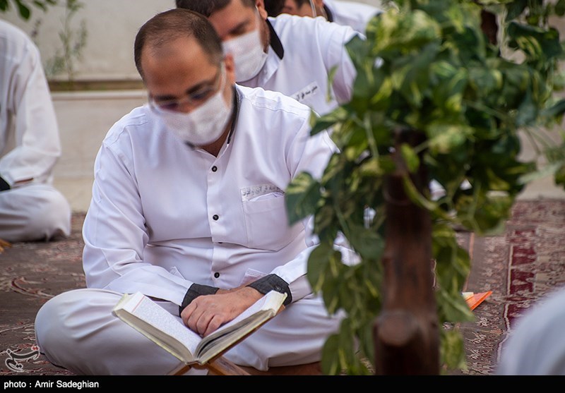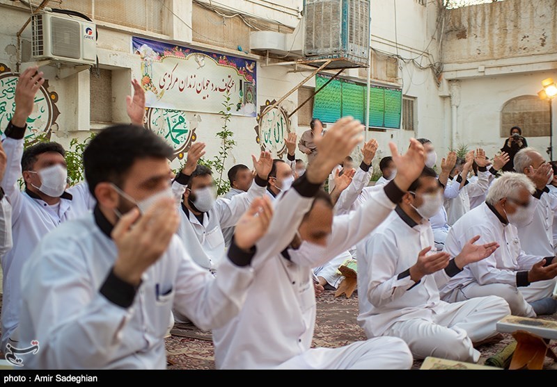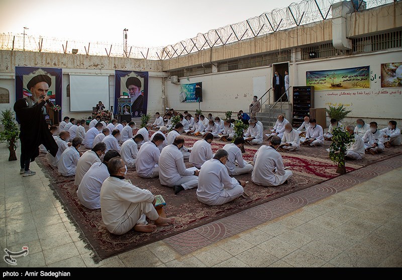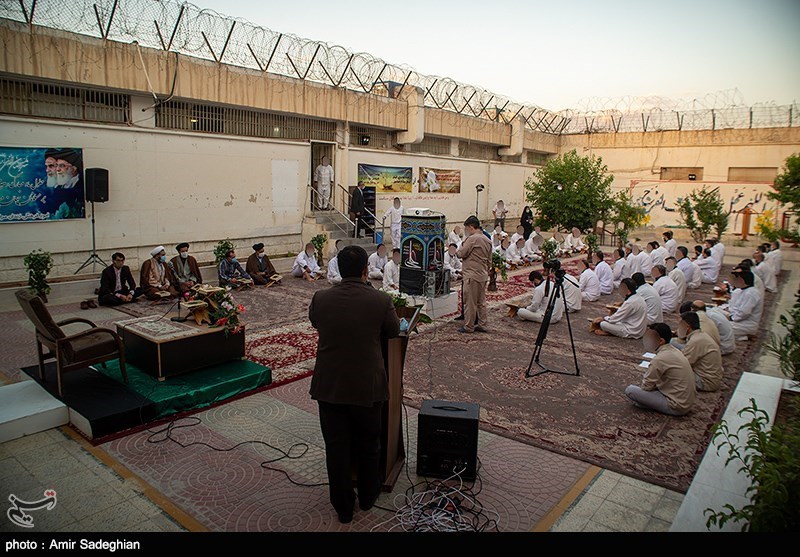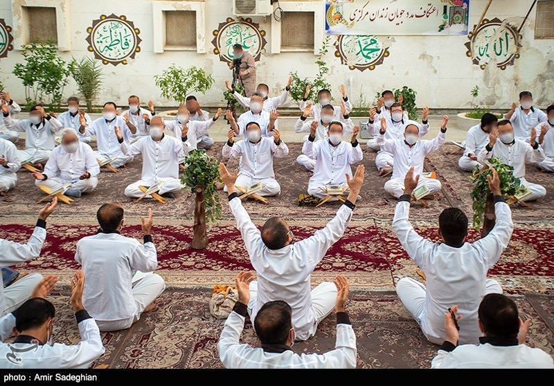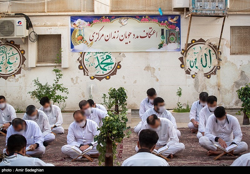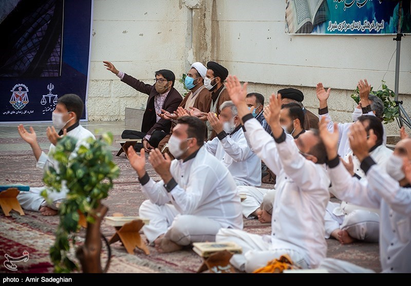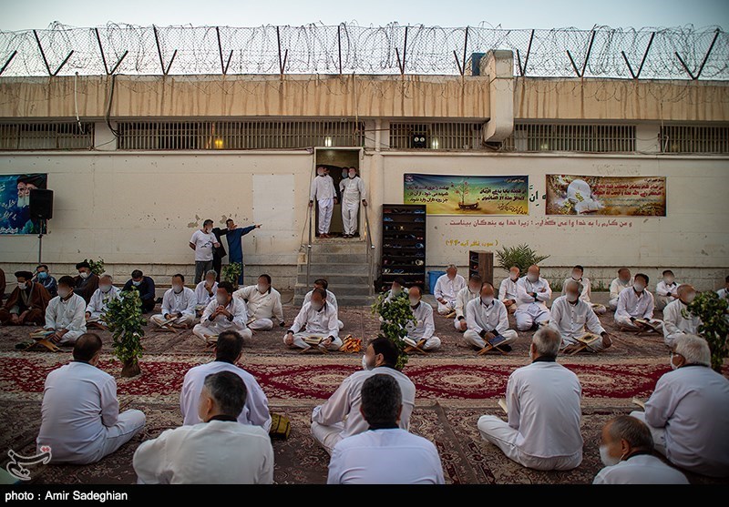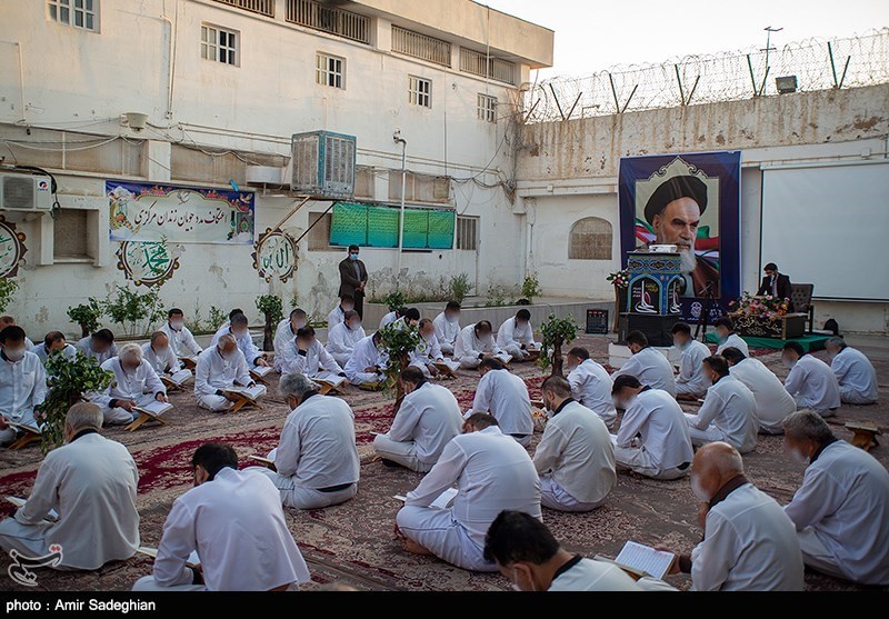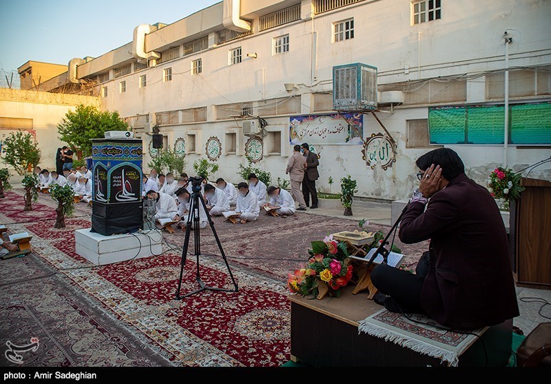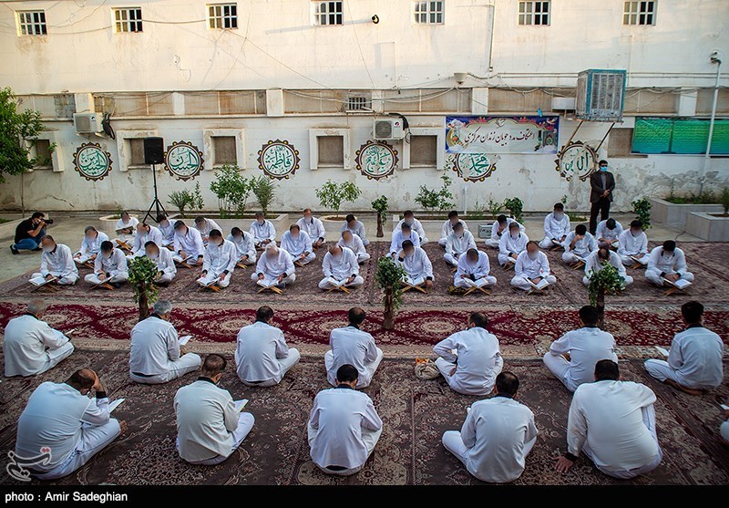 مراسم ترتیل خوانی قرآن مجید و همچنین تواشیح خوانی در ایام ماه مبارک رمضان قبل از نماز مغرب در زندان مرکزی عادل آباد شیراز به همراه جمعی از زندانیان روزه دار با رعایت پرتکل های بهداشتی در فضای باز برگزار میگردد .