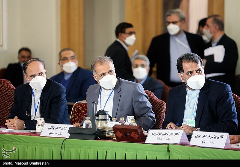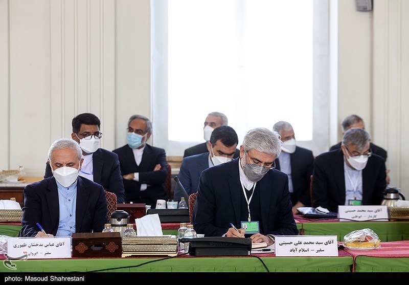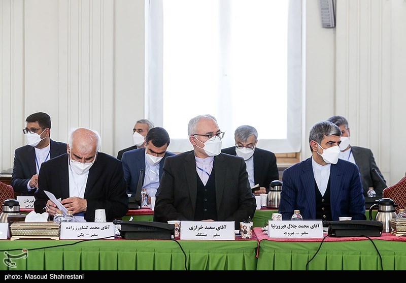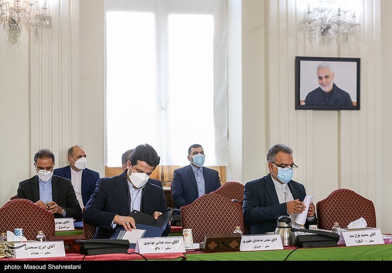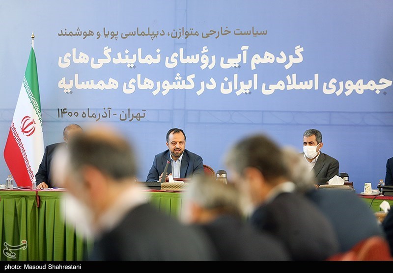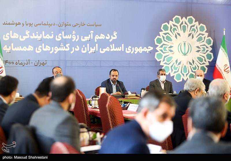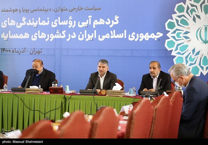 گردهمایی سفرا و روسای نمایندگیهای جمهوری اسلامی ایران در کشورهای همسایه (15 کشور همسایه) امروز یک شنبه 20 آذرماه با حضور سیّد احسان خاندوزی وزیر امور اقتصادی و دارایی, سیدجواد ساداتی نژاد وزیر جهاد کشاورزی ،سید رضا فاطمیامین وزیر صمت و علی صالحآبادی رئیس کل بانک مرکزی در وزارت امورخارجه برگزار شد.